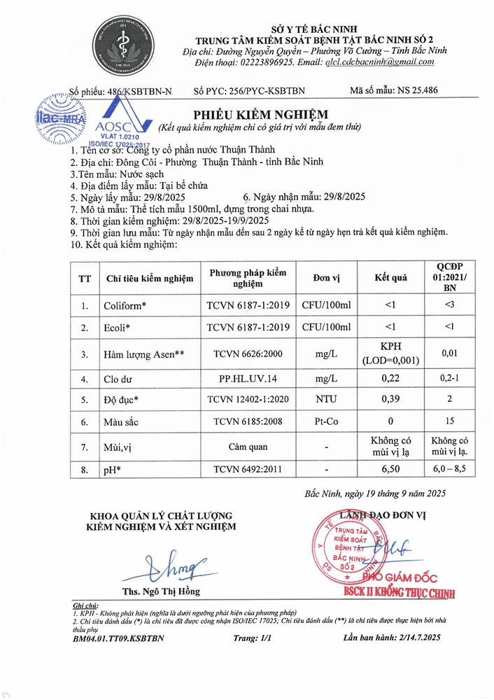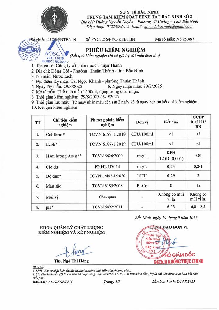 Tổng hợp kết quả chất lượng nước thành phẩm tháng 08.2025